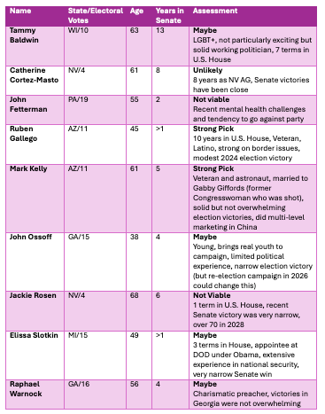 A few quick notes. With only four electoral votes, Nevada Senators are not likely picks. Wisconsin has more electoral votes, but age is not on Tammy Baldwin’s side. One doesn’t want to be discriminate based on age, but after 12 years of Trump and Biden, voters may not want any more hoary retreads. If the nominee is a young, seemingly less experienced nominee emerges, Baldwin could be seen as a sober choice.