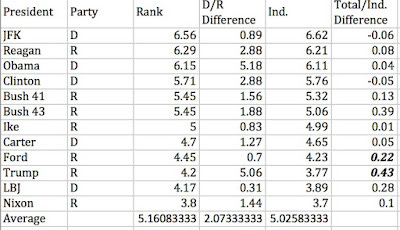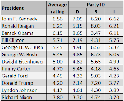 It is interesting to compare the splits between the ratings by party. The average partisan difference is 2.07. The largest splits are over Obama and Trump, both over 5. Somehow this is not a surprise. The Democrats’ rating of Obama is the highest rating of any president by any partisan group and their rating of Trump is the lowest. The Republican rating of Trump is the third highest of any president by partisan group (after Obama by Democrats and Reagan by Republicans). The Republican rating of Obama is the third lowest rating of any president by a partisan group (beating out only Nixon and Trump among Democrats.)