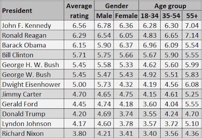 The 18-34 cohort has at best blah ratings for presidents outside their living memory except for JFK (that magic really has lived.) They are huge outliers on Reagan, seeing him as a bit below average.